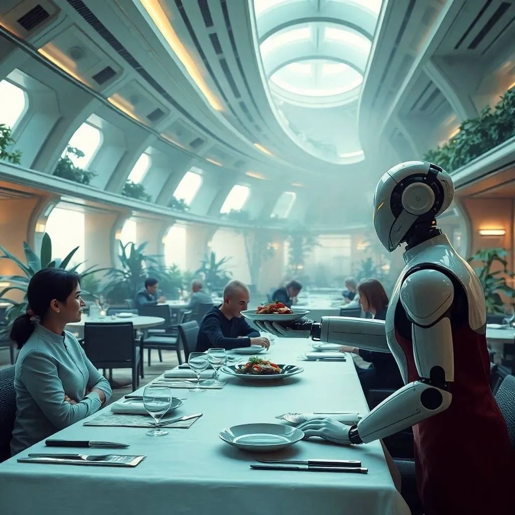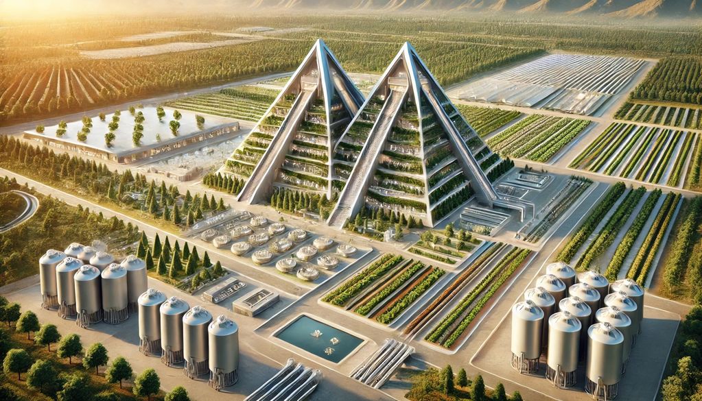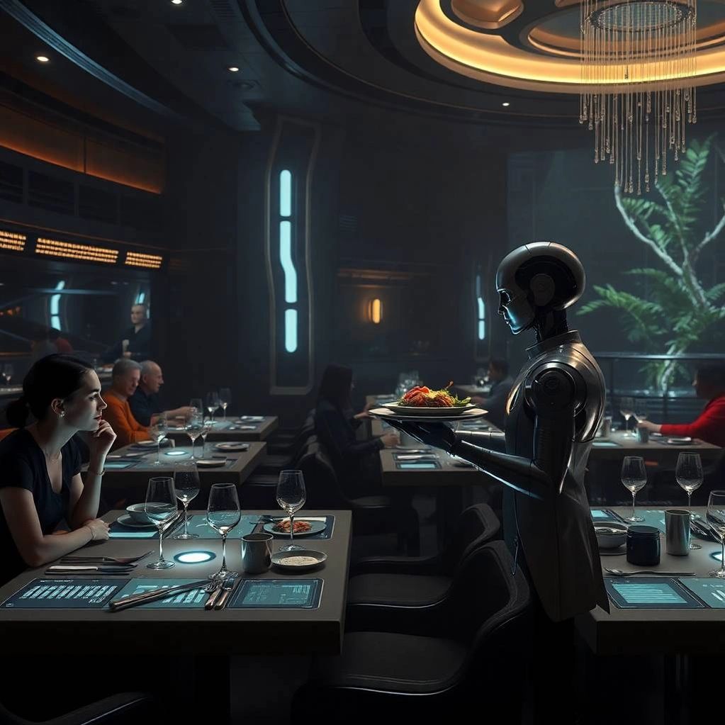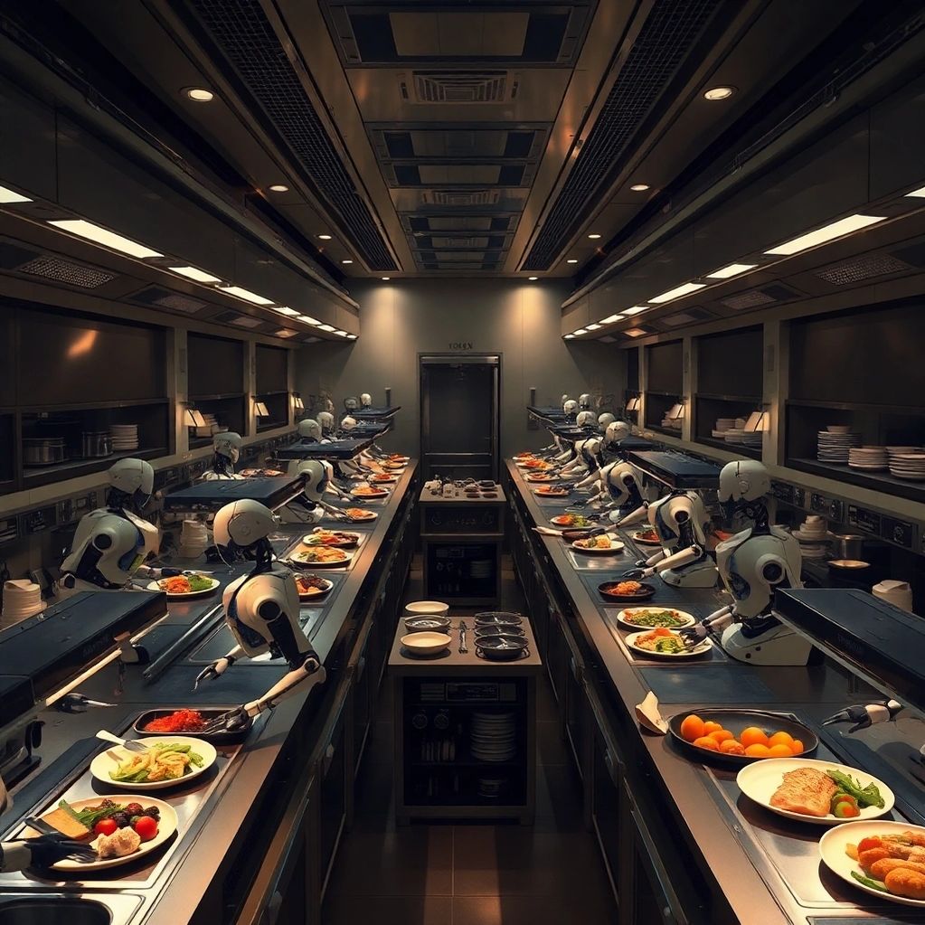 Bulk food sources come from existing world-wide sources but most perishables are grown in adjacent Vertical Farms while bulk foodstuffs are transported in. Prep and cooking are done exclusively by robotic kitchens.